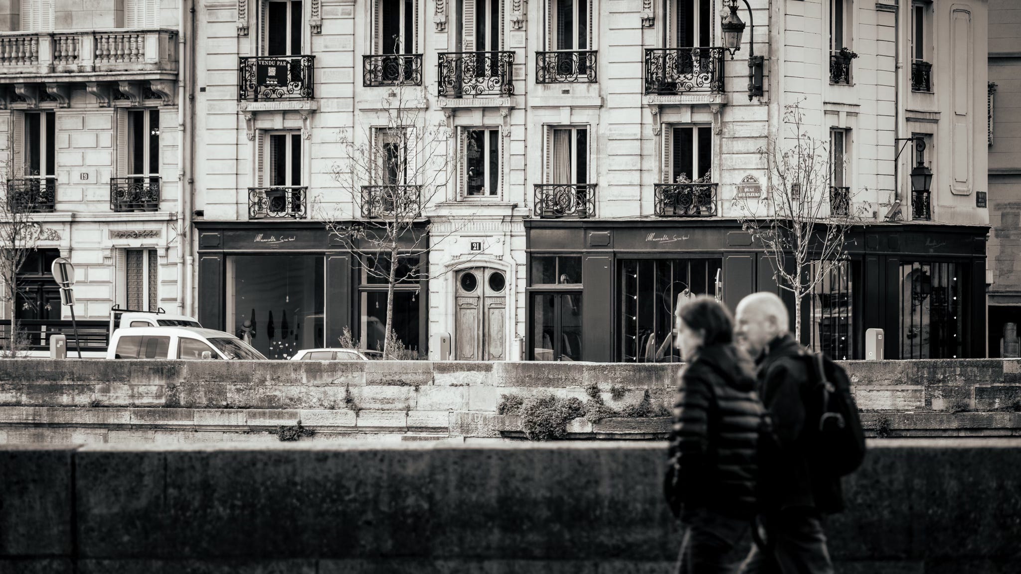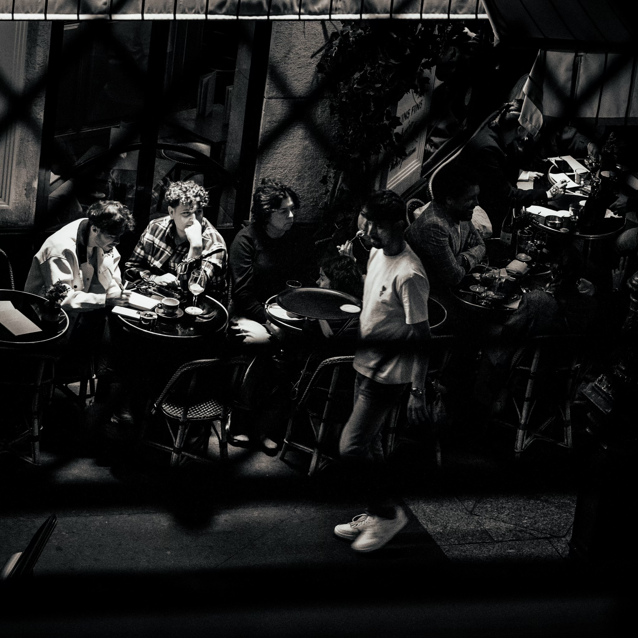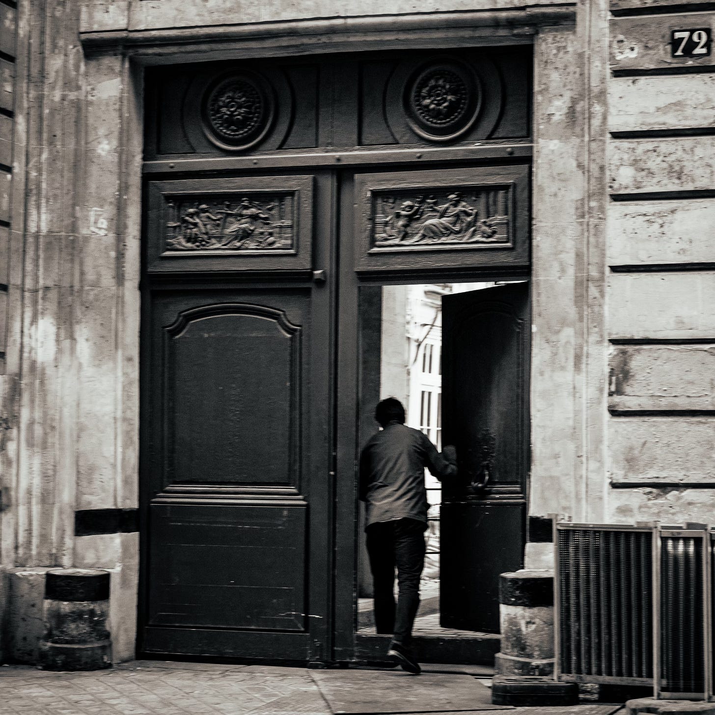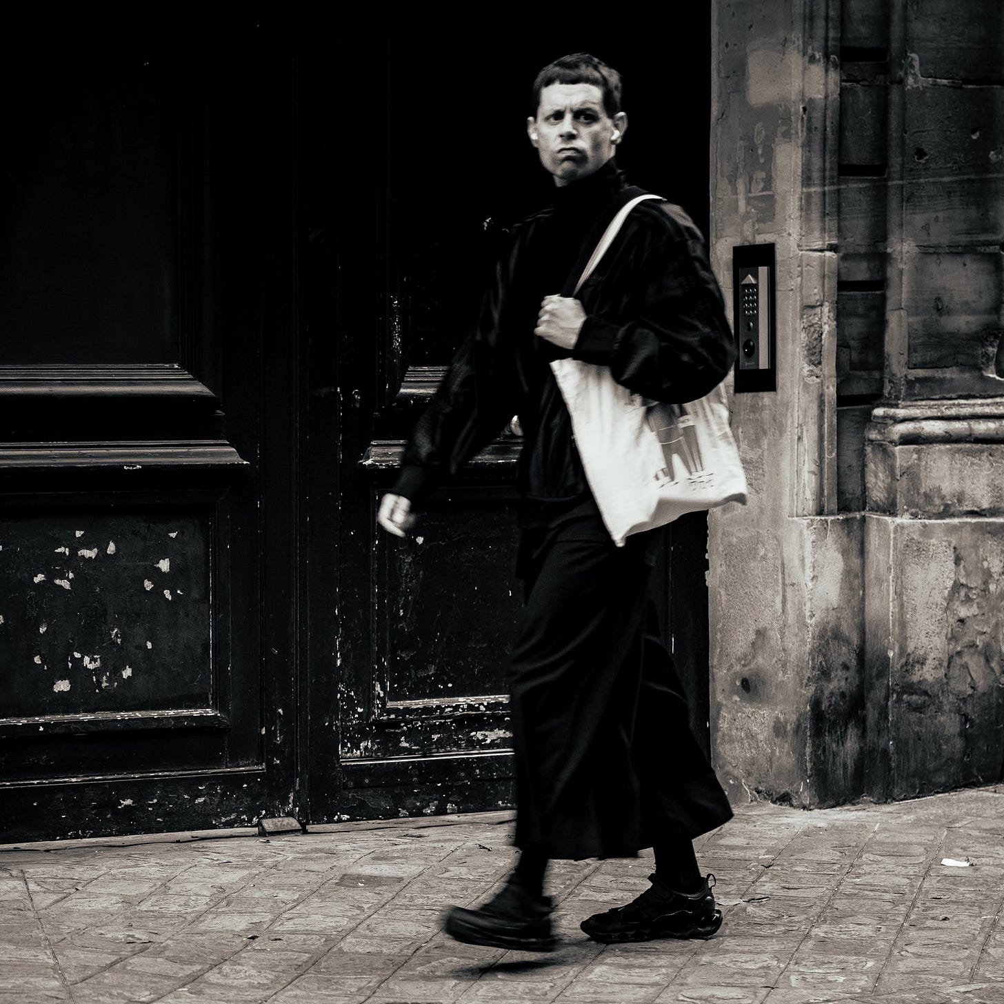 Yet in the same breath, the city pulls the rug out from under you and goes monochrome—because some truths don’t require colour. In black and white, Paris turns anatomical. It reveals the hard bones of doors and stone, the chipped paint and the scuffed history, the way a man’s expression can carry an entire arrondissement of private weather. A stranger strides through the frame with a bag slung over his shoulder, face set like an argument, and suddenly you’re not thinking about fashion or romance—you’re thinking about the daily grind of being a person in a city that never stops demanding performance.