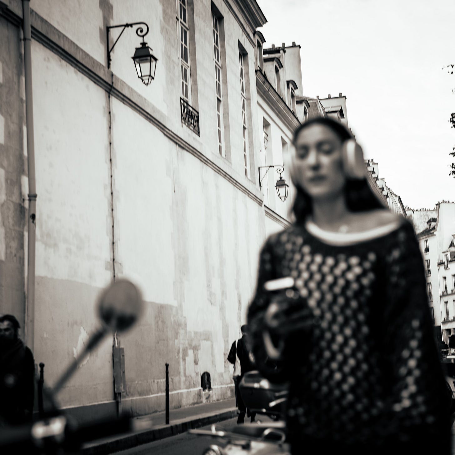 And that’s the punchline, isn’t it? Even the fashionable ones, even the beautiful ones, even the ones floating through the streets with perfect hair and perfect coats—everyone is also just trying to get somewhere. Everyone is carrying a small device of distraction, a coffee cup, a thought they can’t shake. One woman passes half out of focus—headphones like earmuffs against the world—drifting through a pale corridor of buildings as if she’s walking inside her own soundtrack. Paris makes saints of its pedestrians and then immediately returns them to the ordinary.