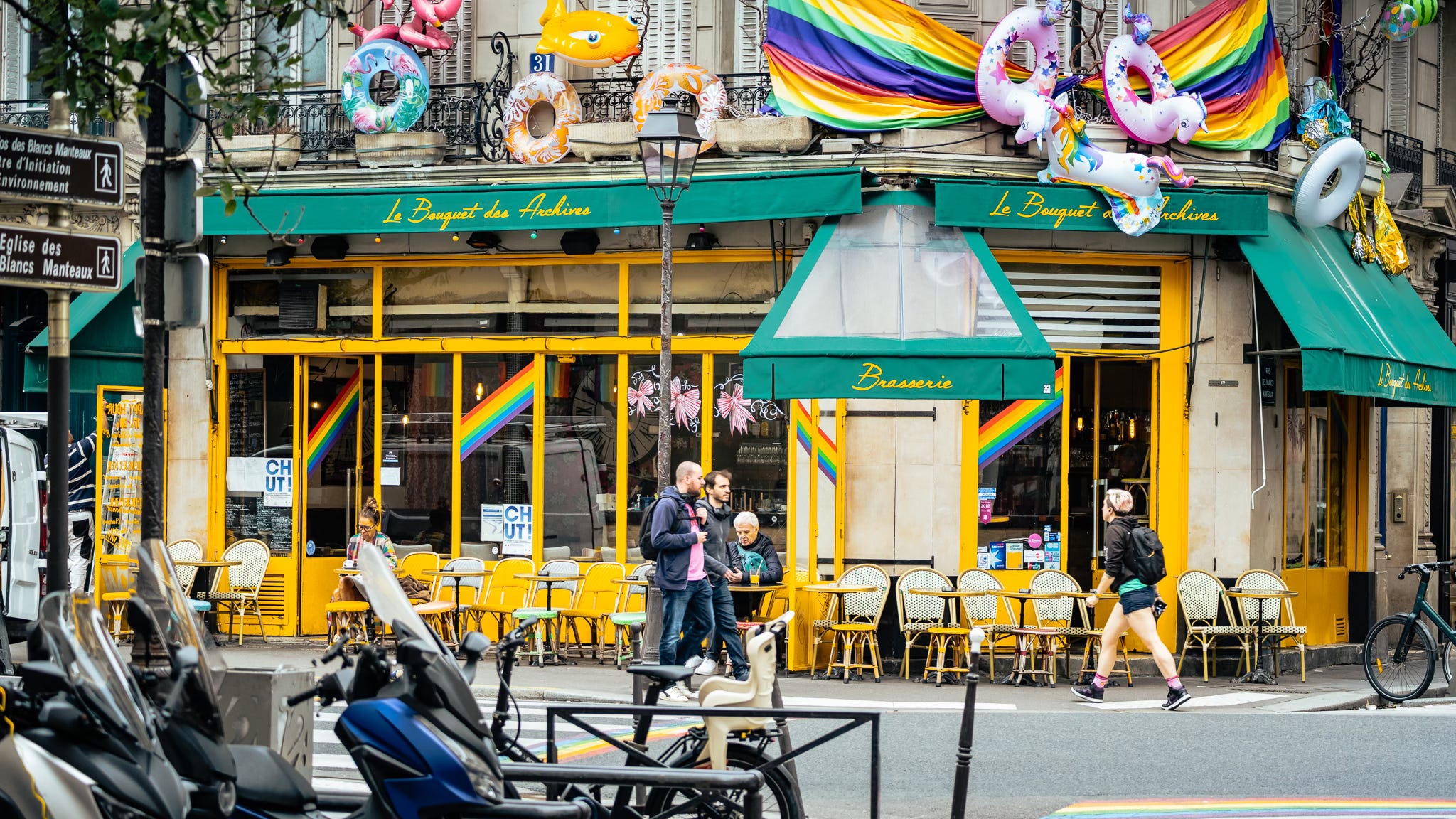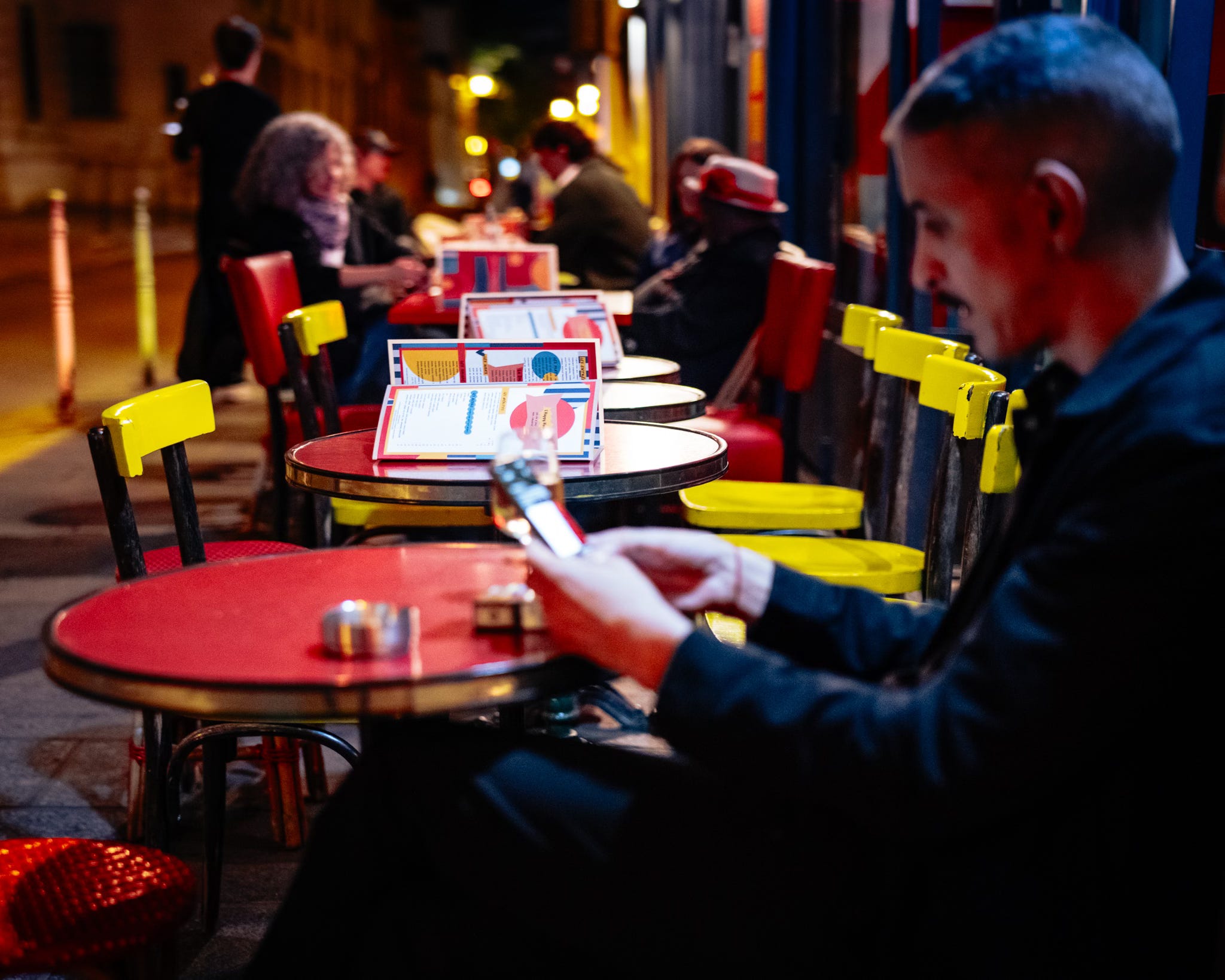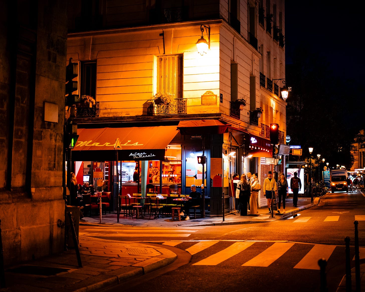 And the colour—Christ, the colour. Not the tasteful kind that behaves. The defiant kind: molten streetlight, orange awnings, crimson tables, yellow chairs like punctuation marks in the dark. A corner brasserie glows as though it’s running on something more volatile than electricity—wine, conversation, possibility. People gather at the edges of that light the way moths gather at a lamp, not for warmth exactly, but for the illusion that warmth is a choice.
